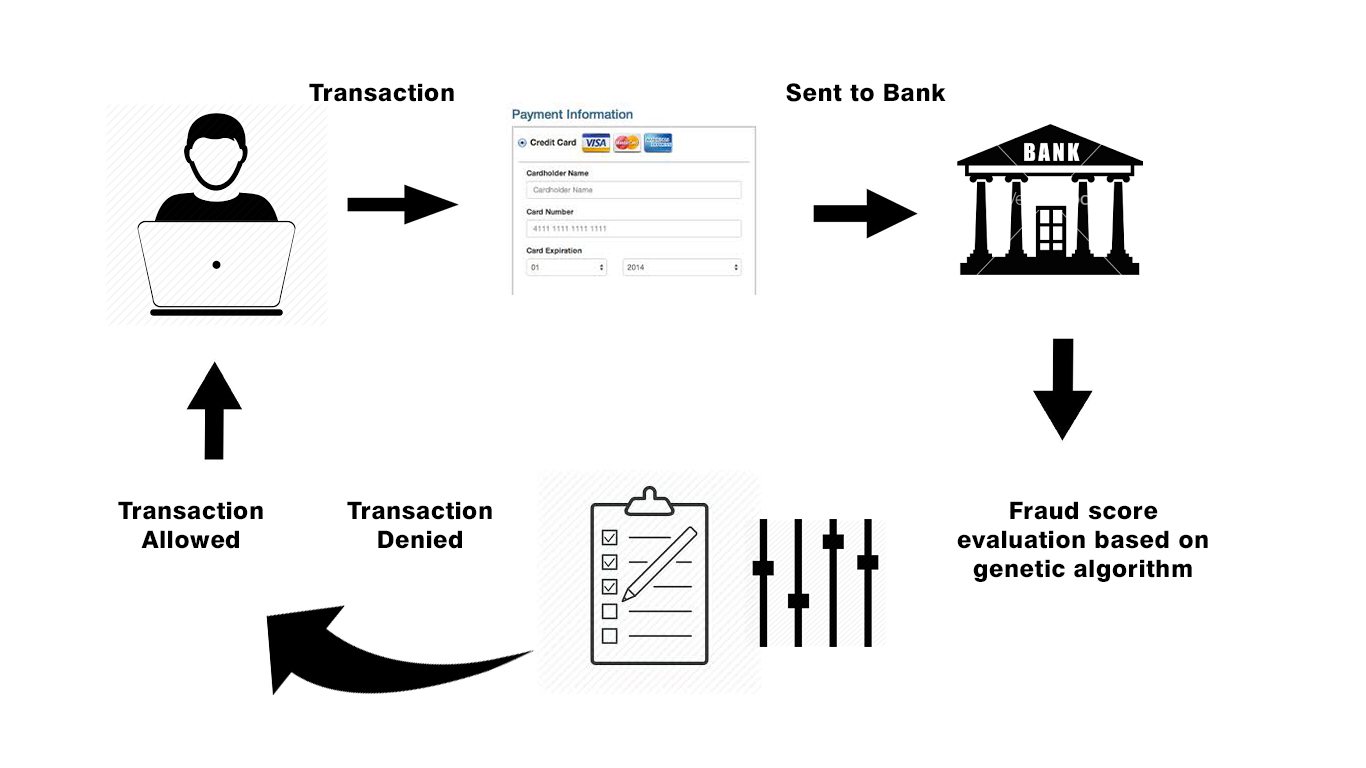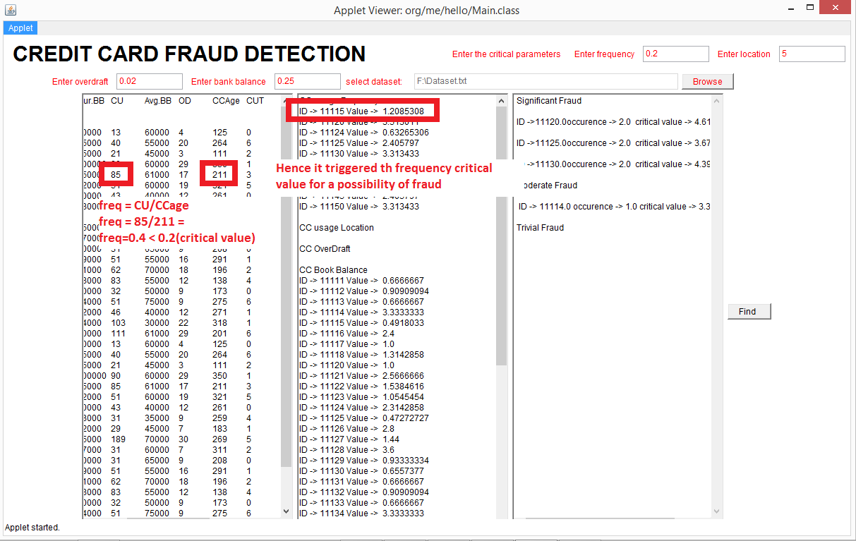 Solution : A software system for banks to detect frauds on basis of comparison with the database of the customer which includes location, frequency of transactions, amount and the trend of user expenditure using Genetic algorithm with an online shopping frontend and java applet backend.